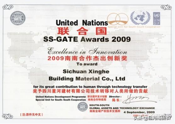 2008年11月3日,联合国南南全球技术产权交易所揭牌仪式及星河建材向全球推广签字仪式在上海举行,联合国副秘书长沙祖康、南南局局长周一平、中国科技部部长万钢、上海市副市长艾宝俊出席仪式,由此拉开了星河集团FGC秸秆建材技术阔步走向世界的序幕。